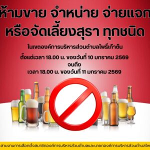 งดขาย จำหน่าย จ่ายแจก หรือจัดเลี้ยงสุราทุกชนิดในเขตเลือกตั้งตั้งแต่เวลา 18.00 น. ในวันเสาร์ที่ 10 มกราคม 2569 จนถึง เวลา 18.00น. ของวันอาทิตย์ที่ 11 มกราคม 256อ่านต่อ…