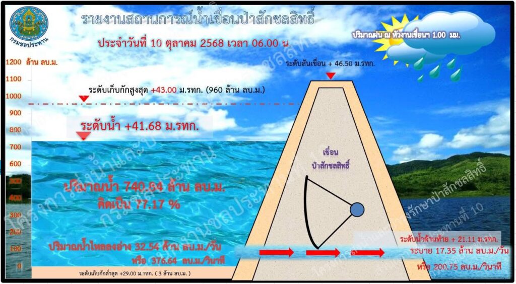 สถานการณ์น้ำ ณ วันที่ 10 ตุลาคม 2568 เวลา 06.00 น. เขื่อนป่าสักชลสิทธิ์ มีปริมาณน้ำ 740 ล้าน ลบ.ม. หรือคิดเป็น 77 % ปริมาณน้ำไหลลงอ่าง 376 ลบ.ม./วินาที หรือ 32 ล้าน ลบ.ม./วัน ปริมาณการระบาย 200 ลบ.ม./วินาที หรือ 17 ล้าน ลบ.ม./วัน จากการติดตามและคาดการณ์ปริมาณน้ำ ไหลลงอ่างเก็บน้ำเขื่อนป่าสักชลสิทธิ์ ด้านเหนือเขื่อน 7 วันข้างหน้า ปริมาณน้ำที่จะไหลเข้าเขื่อนฯ มีแนวโน้ม ลดลงต่อเนื่อง เพื่อเป็นการลดปริมาณน้ำที่จะไปรวมกับแม่น้ำเจ้าพระยา รวมทั้งเพื่อช่วยลดผลกระทบด้านท้ายเขื่อนป่าสักชลสิทธิ์ และเป็นการควบคุมระดับน้ำและปริมาณน้ำในเขื่อนป่าสักชลสิทธิ์ให้อยู่ในเกณฑ์ที่เหมาะสม โครงการส่งน้ำและบำรุงรักษาป่าสักชลสิทธิ์จะดำเนินการปรับลดการระบายน้ำ จากเดิมอัตรา 200 ลบ.ม./วินาที เป็นอัตรา 100 ลบ.ม./วินาที โดยจะทยอยปรับลดการระบายน้ำแบบขั้นบันไดเป็นลำดับตั้งแต่ วันที่ 13 ตุลาคม 2568 เป็นต้นไป