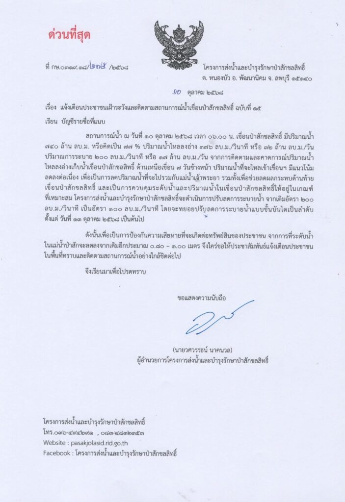 เขื่อนป่าสักชลสิทธิ์ปรับลดการระบายน้ำ จากเดิมอัตรา 200 ลบ.ม./วินาที เป็นอัตรา 100 ลบ.ม./วินาที โดยจะทยอยปรับลดการระบายน้ำแบบขั้นบันไดเป็นลำดับตั้งแต่ วันที่ 13 ตุลาคม 2568 เป็นต้นไป