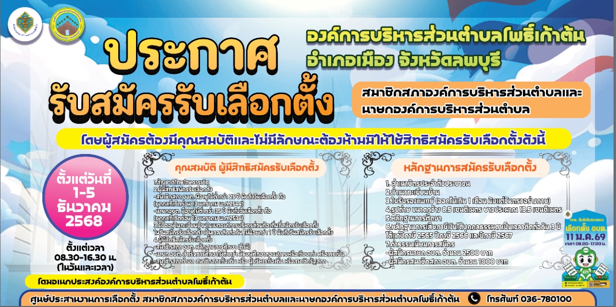 📢 องค์การบริหารส่วนตำบลโพธิ์เก้าต้น ขอประชาสัมพันธ์เชิญชวนประชาชนผู้มีคุณสมบัติและสนใจ ลงสมัครรับเลือกตั้งเป็น สมาชิกสภาองค์การบริหารส่วนตำบลโพธิ์เก้าต้น และนายกองค์การบริหารส่วนตำบลโพธิ์เก้าต้น