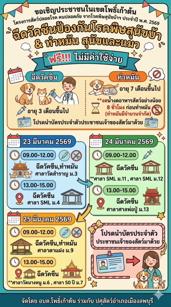 กองสาธารณสุขและสิ่งแวดล้อม องค์การบริหารส่วนตำบลโพธิ์เก้าต้น ร่วมกับ ปศุสัตว์อำเภอเมืองลพบุรี จัดโครงการสัตว์ปลอดโรค คนปลอดภัย จากโรคพิษสุนัขบ้าฯ ประจำปี พ.ศ. 2569
