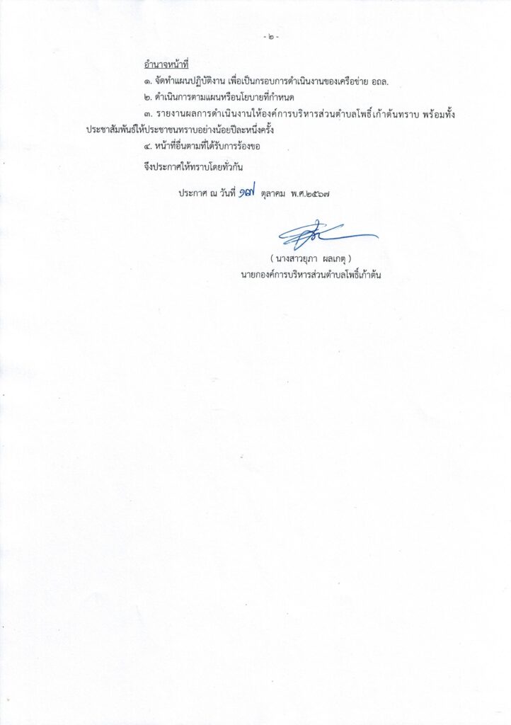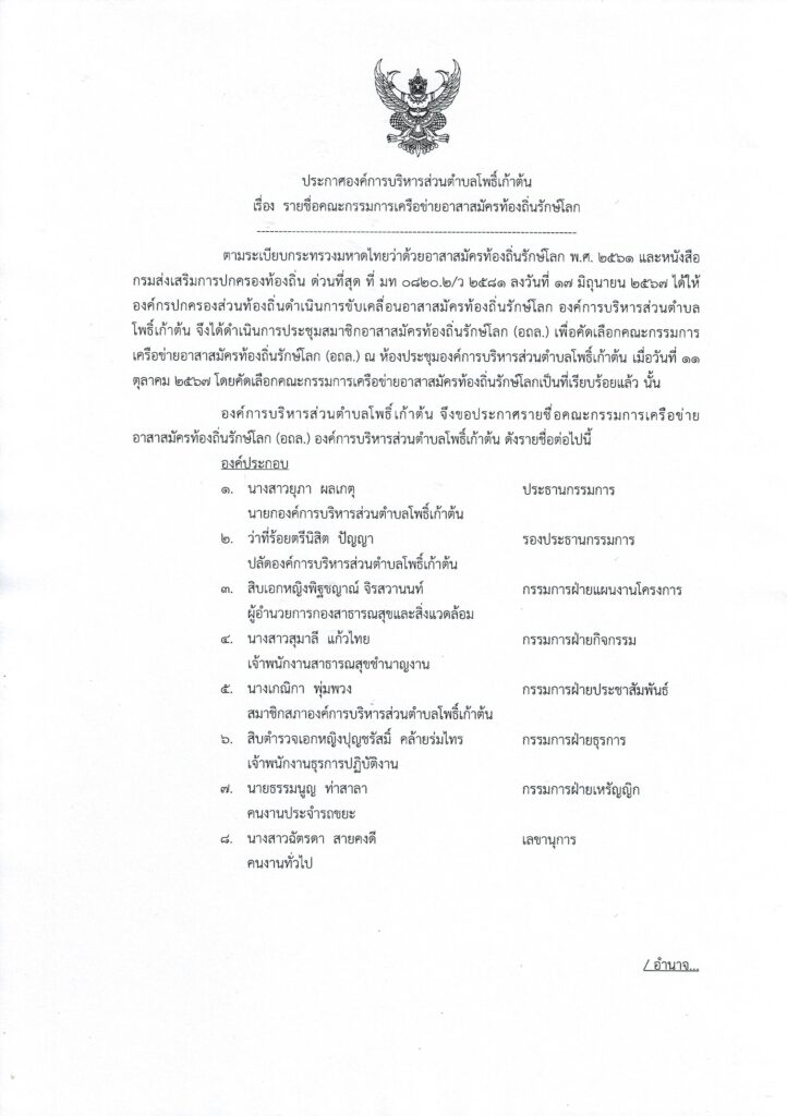 องค์การบริหารส่วนตำบลโพธิ์เก้าต้น ขอประกาศรายชื่อคณะกรรมการเครือข่ายอาสาสมัครท้องถิ่นรักษ์โลก รายละเอียดปรากฎตามเอกสารด้านล่างนี้
